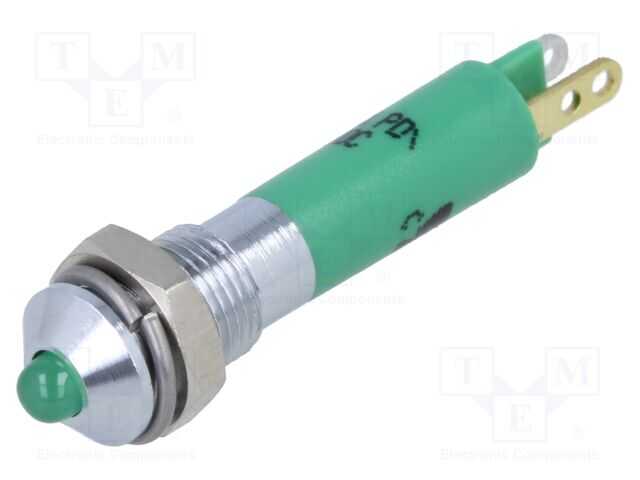 Gösterge: LED; çıkık; yeşil; 12VDC; Ø6mm; IP40; metal,plastik; 8mcd