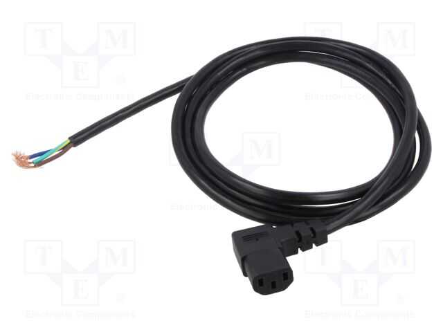 Cable; 3x18AWG; IEC C13 female angled right,wires; PVC; 2m; black