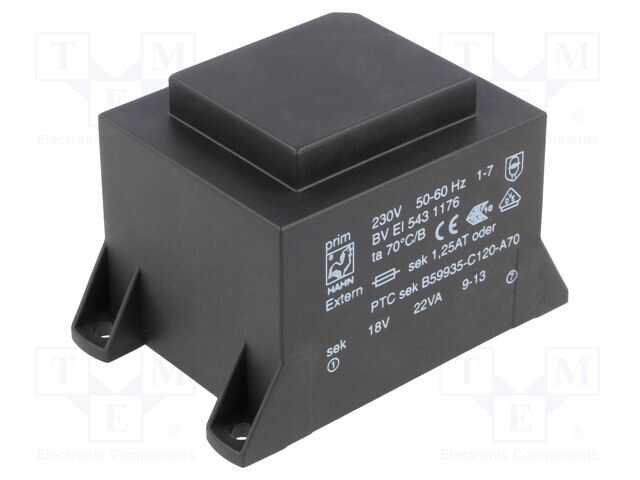 Trafo: kapalı; 22VA; 230VAC; 18V; 1223mA; PCB; Termal sınıf: Ta70C/B