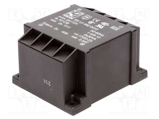 Trafo: kapalı; 60VA; 115VACx2; 15V; 15V; 2A; 2A; PCB; BVUI