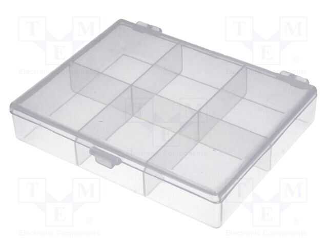 Konteyner: kolektif; bölmeli; polipropilen; şeffaf; 118x90x22mm