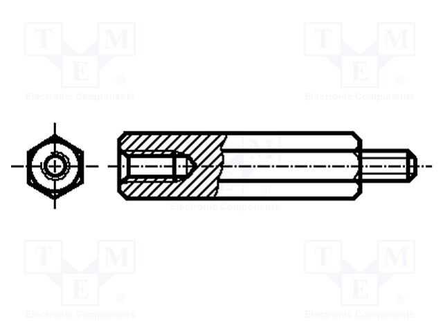 Ara manşon; 7mm; İç diş: M4; Dış diş: M4; altı köşe; pirinç; nikel